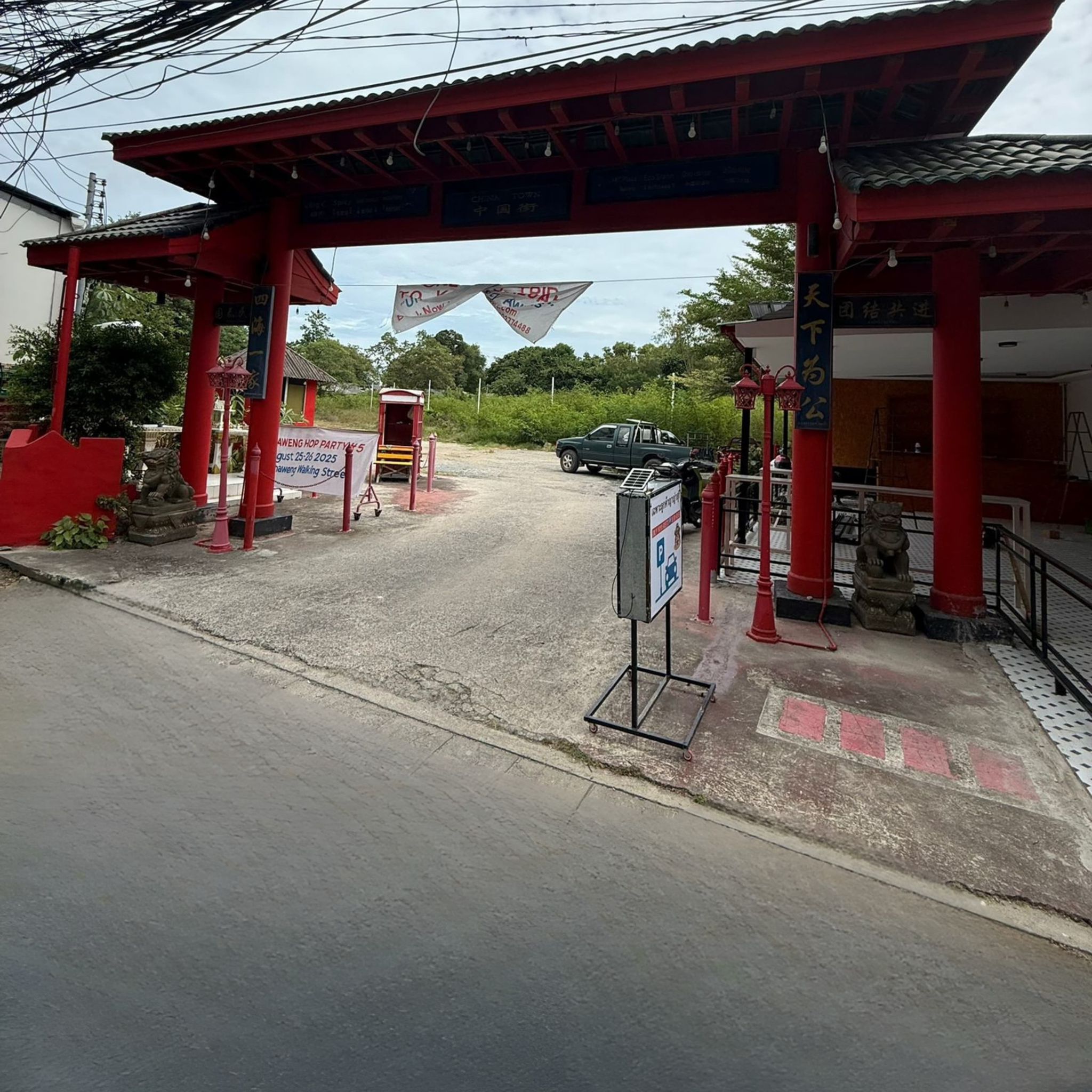 Please drive through the red arch and the car park is behind it.